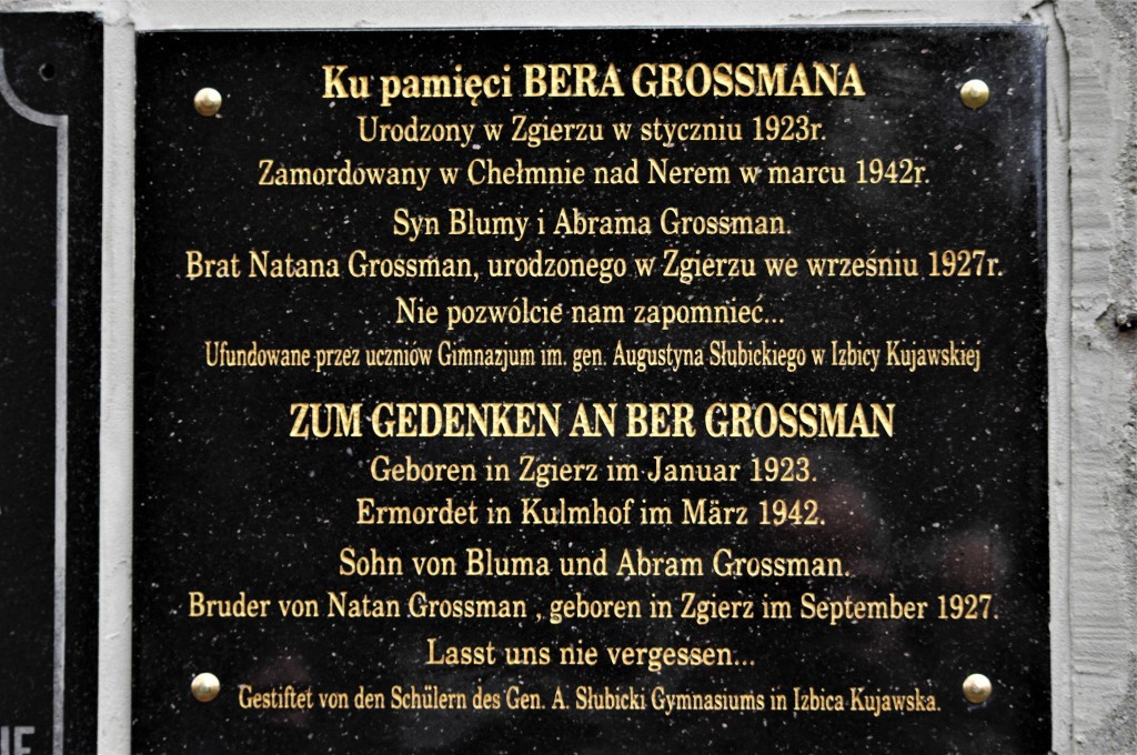 Ber Grossman, Bruder Natan Grossmanns, wurde neunzehnjährig im März 1942 im nahe gelegenen deutschen Vernichtungslager Kulmhof/Chelmno ermordet, ebenso wie ein Großteil der jüdischen Bevölkerung von Izbica Kujawska. In Gedenken an Ber sind wir mit Natan Grossmann auf Reisen nach Polen gegangen, an die Orte ihrer beider Kindheit (insbesondere Zgierz bei